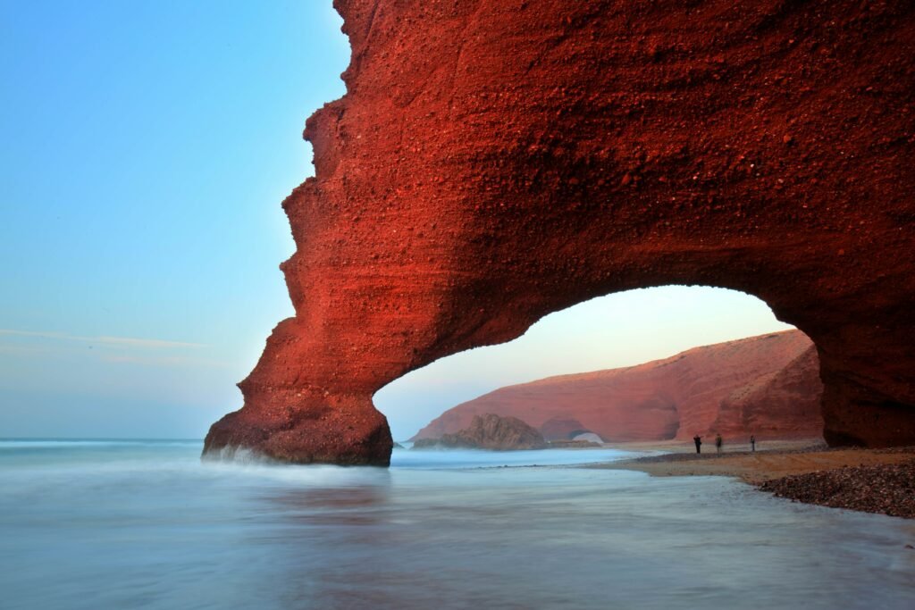 Sur la côte atlantique, les falaises rouges de Mirleft surplombent l’océan. Un contraste puissant entre la mer, la montagne et la piste qui serpente.